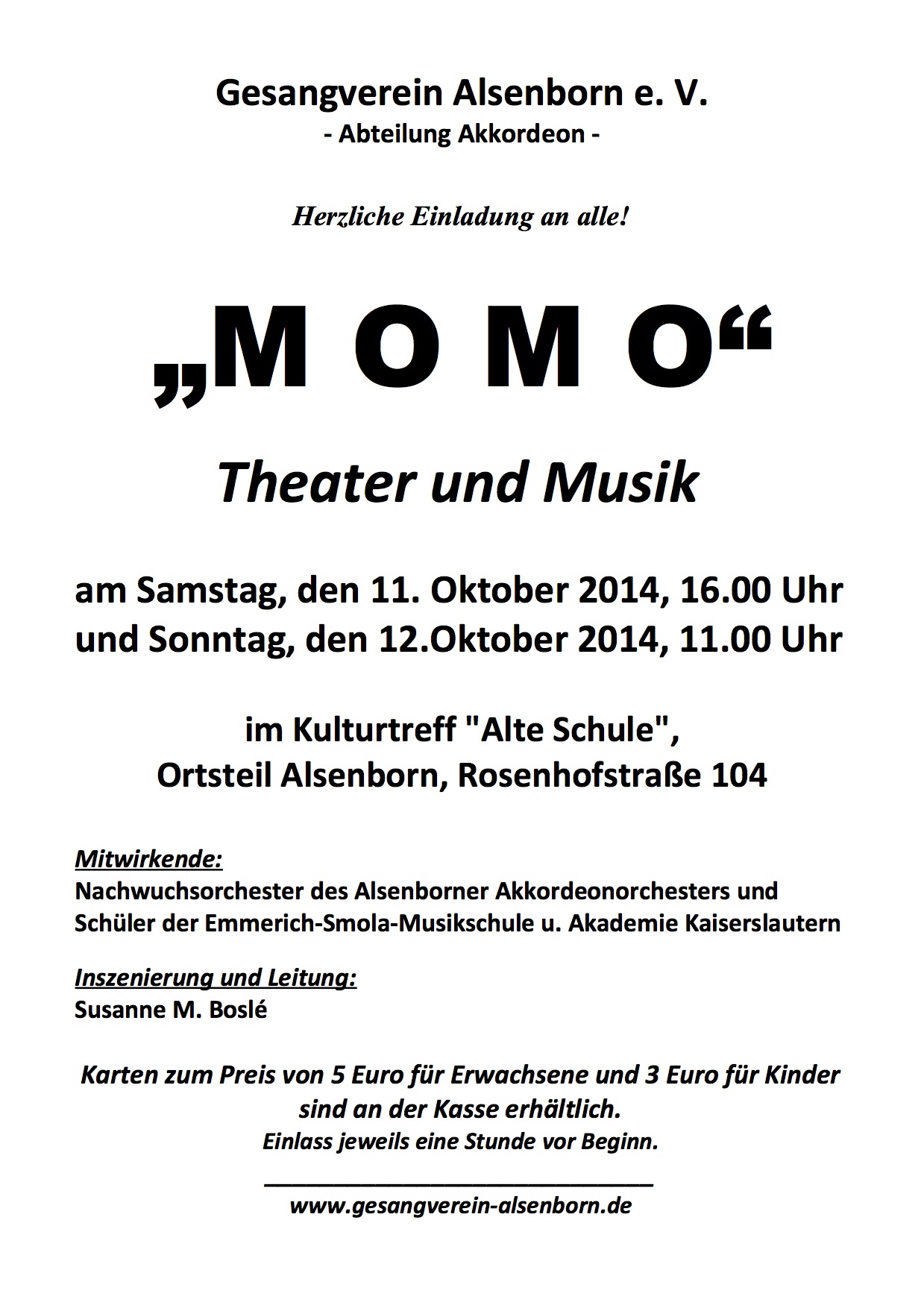 Diese rührende Geschichte, kombiniert mit der Musik von Jean-Claude Séférian, bringt am 11. Oktober um 16.00 Uhr und am 12. Oktober um 11.00 Uhr im Kulturtreff „Alte Schule“, der Nachwuchs des Alsenborner Akkordeonorchesters des GVA , zusammen mit den Akkordeonschülern der Emmerich-Smola-Musikschule und Akademie der Stadt Kaiserslautern, unter der Leitung von Susanne M. Boslé, auf die Bühne. Karten gibt es an der Kasse.